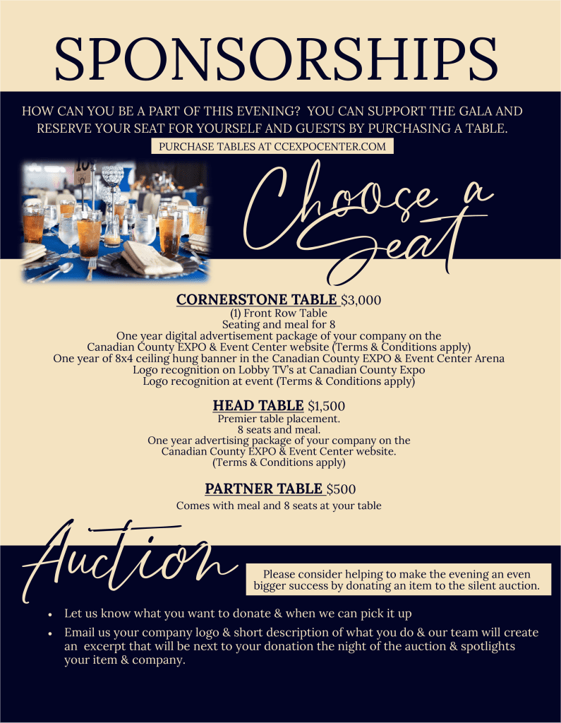 Hosted at the Canadian County EXPO & Event Center, the Community Night Gala is a banquet style evening with a meal, silent auction and live music . Each year this event benefits a different organization inside Canadian County that meets the needs of our most vulnerable. We’re inviting you to join the Community Night Gala in support of those doing good in our county.